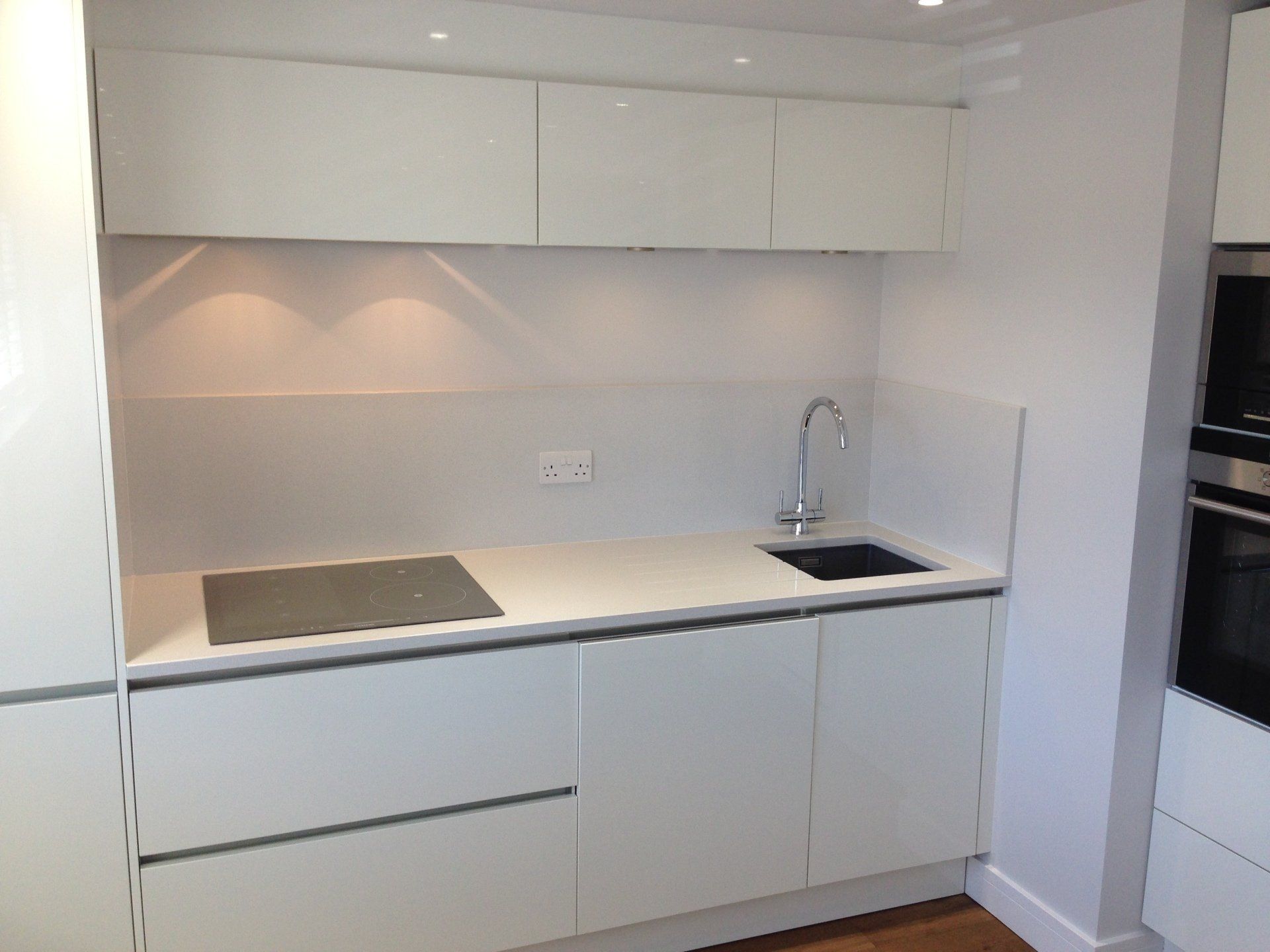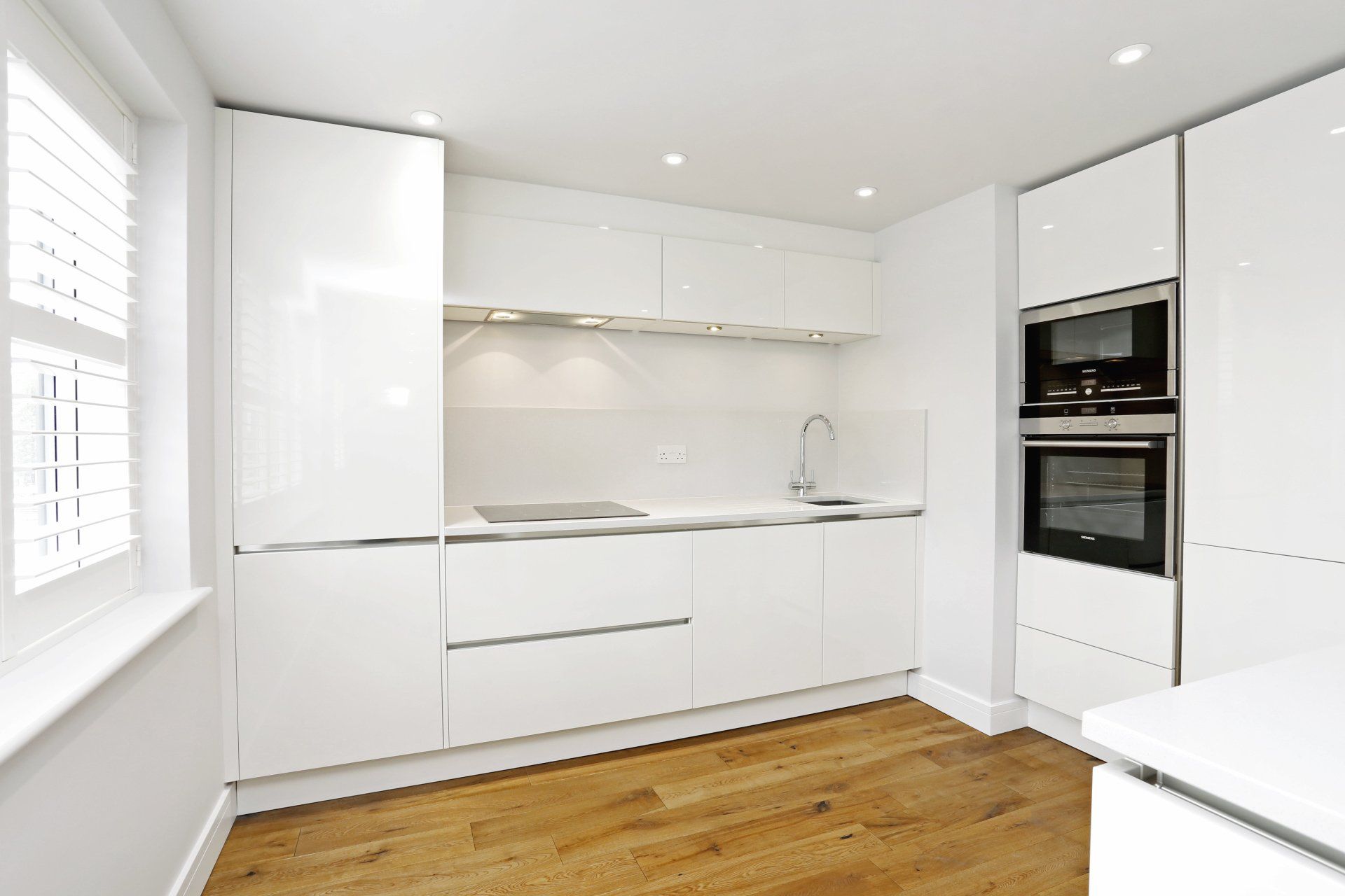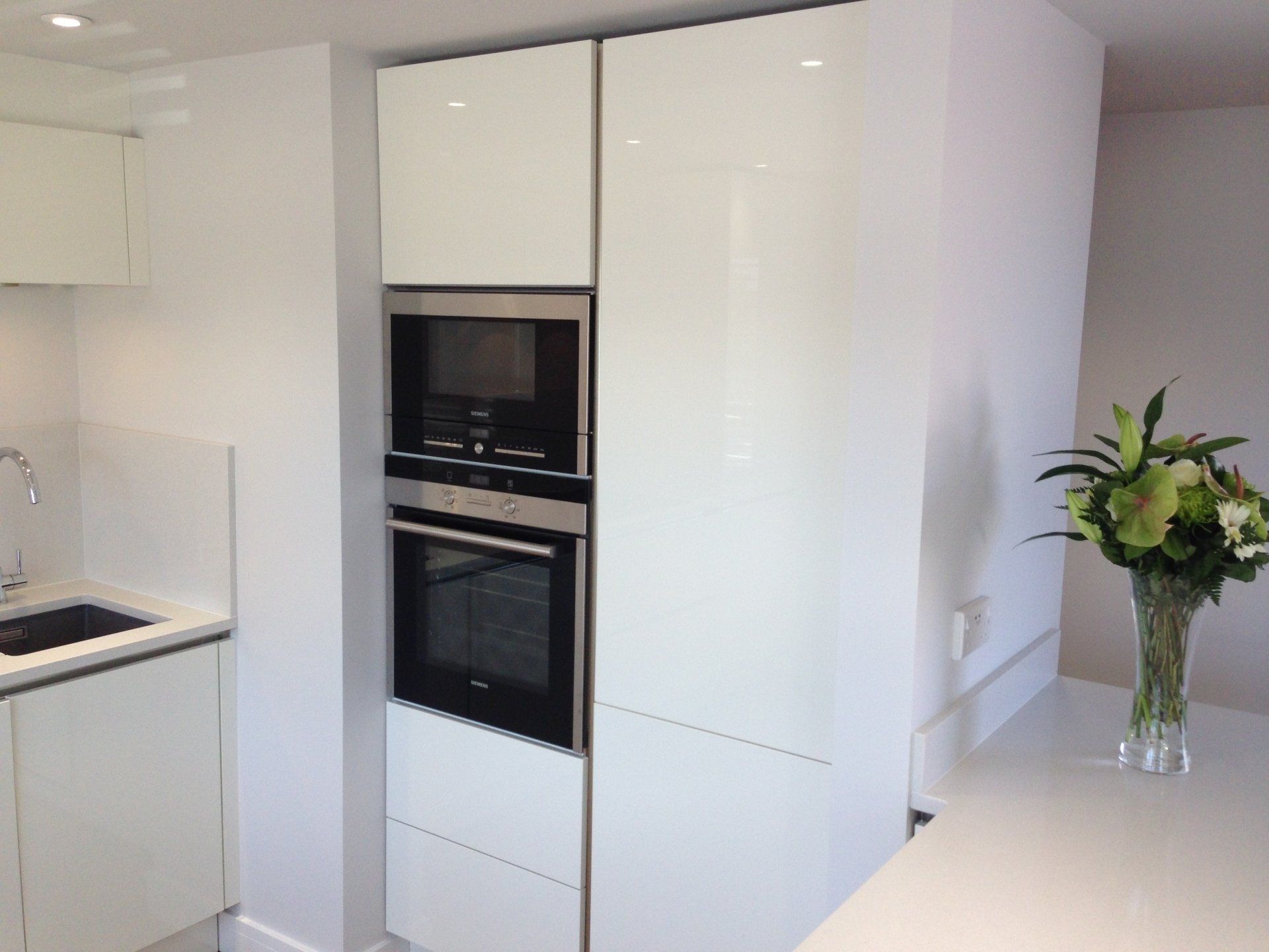 Kitchen: High gloss white German units, Siemens oven, microwave, induction hob, fridge freezer, dishwasher and extractor. Matching composite worktops.