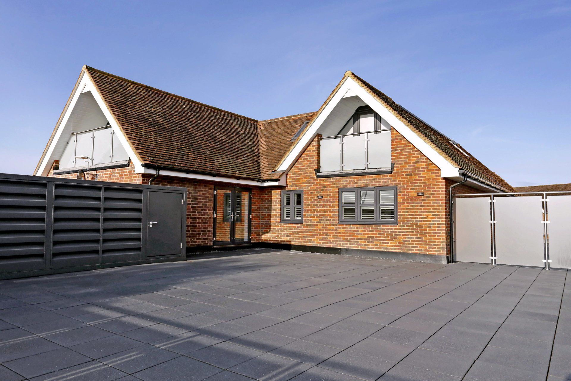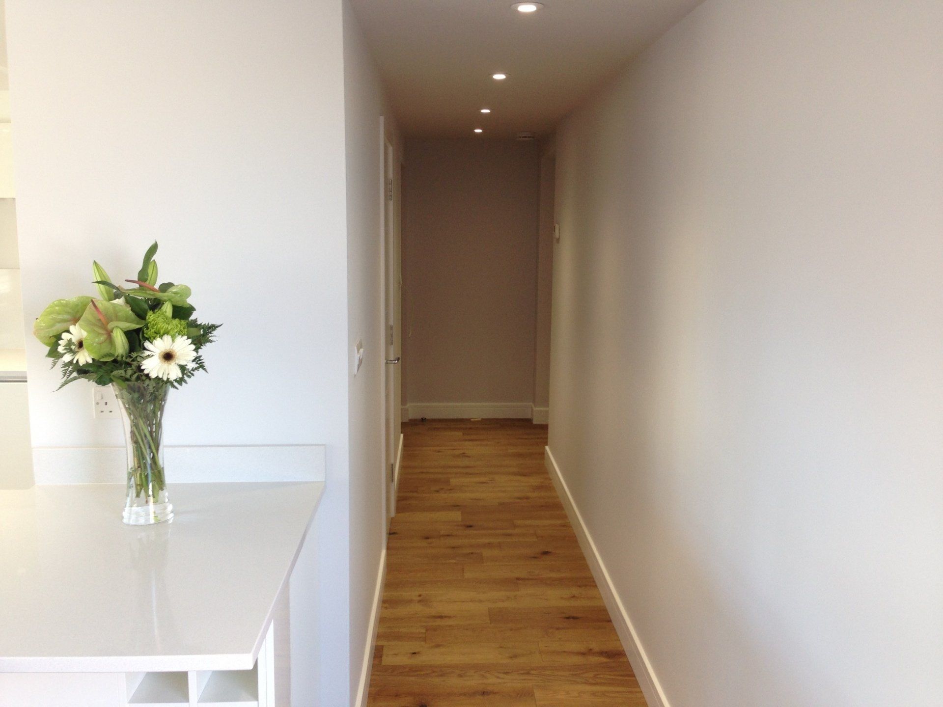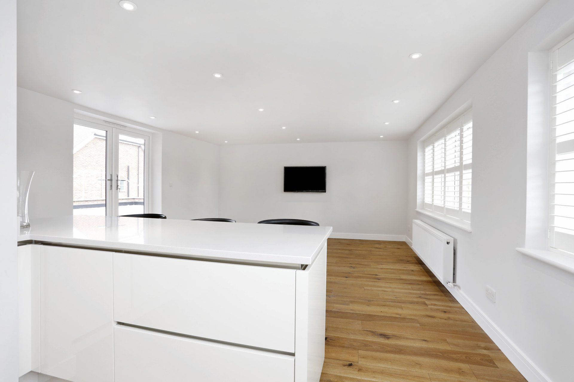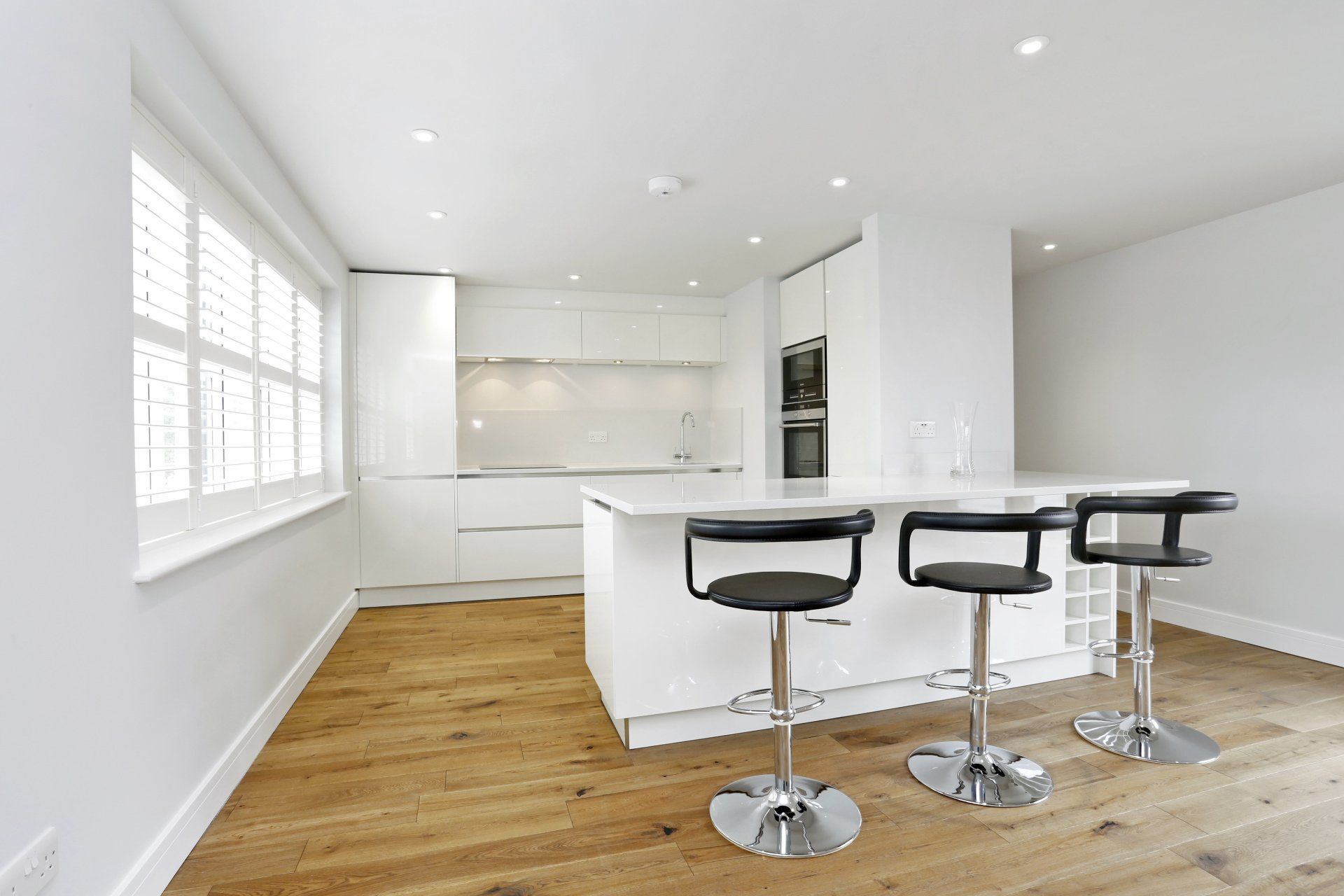 Kitchen: High gloss white German units, Siemens oven, microwave, induction hob, fridge freezer, dishwasher and extractor. Matching composite worktops.