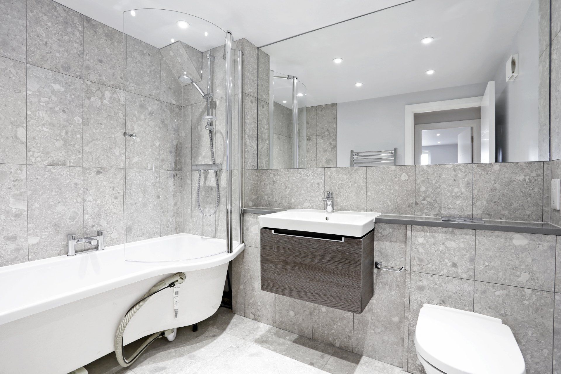 Bathroom: Villeroy Boch sanity ware, Hansgrohe taps and Italian tiled walls and floors.